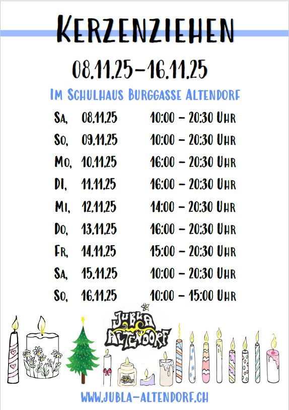 Ob als Geburstags-, Weihnachtsgeschenk oder für sich selbst, mit einer geschnitzten Kerzen liegt man selten falsch. Auch diese Jahr findet wieder das alljährliche Kerzenziehen statt. Es sind somit alle willkommen, vom 8.-16. November 2025 Ihrer Kreativität freien Lauf zu lassen und sich selbst eine oder mehrere Kerze zu ziehen, wie auch sie zu schnitzen und zu verzieren.